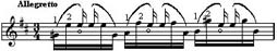 Если в Концерте И.Брамса прямой штрих выявляет масштабность звучания, то пунктирный ритм в Концерте Я.Сибелиуса, исполняемый обратным штрихом, характерен стремительностью, полетностью (пример 53).