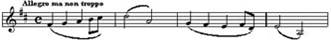 Нетрудно заметить, что указанные лиги не имеют никакого отношения к фразировочным лигам и приведенный мелодический отрывок состоит не из четырех фраз, а одной. Равномерное распределение целого смычка применимо здесь для выявления спокойного, повествовательного характера мелодии.