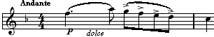 Пример 45.е - Ямбическая пара. Пауза между слабой и сильной нотами, которая придает такому виду артикуляции своеобразный колорит, выполняет две функции: разделяет ноты внутри пары и способствует форсированной атаке второй ноты пары. Причем пауза между парами почти отсутствует. В музыкальной практике этот прием называется штрих Виотти (пример 50):