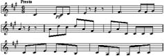 Пары, объединяющие тоны одинаковой длительности, могут быть хореическими (хорей - вид артикуляции, когда первая нота сильная, а вторая - слабая) или ямбическими (ямб - вид артикуляции, когда первая нота слабая, а вторая - сильная). Причем, длительность одной ноты из пары может быть полноценной или укороченной за счет точки под нотой (staccato) или выписывания укороченной длительности с соответствующей паузой.