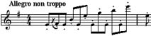 В эту же артикуляционную группу входит и штрих saltando, который исполняется движением смычка вниз, озвучивая сразу несколько нот. Если по характеру звучания saltando похоже на spiccato, то по технике исполнения оно родственно со штрихом ricochet. Независимо от темпа исполнения скрипачи разделяют эти штрихи по простому принципу: короткие фразы исполняются приемом saltando (пример 37), а длинные гаммообразные пассажи - штрихом ricochet (пример 38).