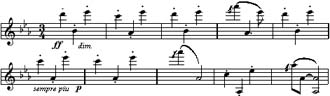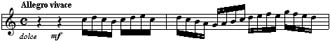 Если при исполнении флешевского штриха смычку придать поступательное движение к колодке, то получится staccato Volant. Этим штрихом удобно исполнять не очень большие последовательности нот, как мы это видим, например, в пьесе Ф.Крейслера Прекрасный розмарин (пример 36):