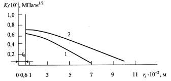 Рис.6. Изменение коэффициента интенсивности напряжений в зависимости от радиусов зон напряжений в окварцованных сланцах (1) и в гранитах (2).