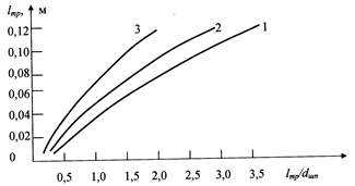 Изменения размеров направленных трещин с изменением радиуса шпурового отверстия показали, что с ростом диаметра шпура (dшп, м) при неизменном давлении несколько растут и их длины, в то время как относительные размеры К=lтр/dшп резко снижаются (рис.8).