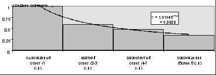 21 Однозначные реплики встречались в 22% нормативных ответов и 34% реактивных. Способ определения экспертного ответа (присутствие фактов и общих суждений) делает невозможным его представление с помощью одной фразы. Более того, экспертный тип ответа, гораздо чаще представлен длительными рассуждениями — 21% случаев, нормативный — 4%, реактивный — 2%.