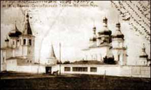 От дома настоятеля можно увидеть все постройки монастыря - обе церкви, Троицкий собор, деревянные здания служб и келий, ограду. Высокая, почти крепостная ограда с массивными пилястрами и контрфорсами на внешних углах, сомасштабна мощным формам церквей и тесно с ними связана. Все три монастырских храма были поставлены по диагонали таким образом, что при взгляде из города они не перекрывают друг друга и компонуются в сложную композицию. В центре этой композиции оказывается самый статичный и массивный Троицкий собор - главная ось и центр тяжести всего ансамбля.