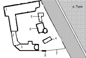 Граница образована с трех сторон стеной комплекса и примыкающей к ней церкви Петра и Павла, зданий тюменской семинарии, а с восточной стороны берегом реки Тура.