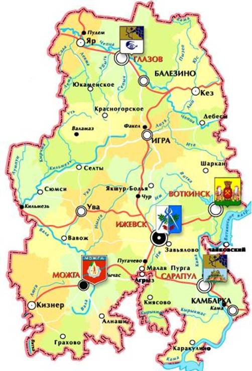 Географическое положение. Удмуртская республика расположена в Предуралье в междуречье Камы и Вятки. Протяженность территории с севера на юг 270 км, с запада на восток — 180 км. Удмуртия граничит: на севере и северо-западе — с Кировской областью, на востоке — с Пермской областью, на юго-востоке — с Республикой Башкортостан, на юге — с Республикой Татарстан.