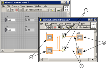 В основе программирования в LabVIEW лежит понятие Виртуальных приборов (Virtual Instruments, VI). На лицевой панели, как и положено, располагаются элементы управления программой – кнопки, графики, выключатели и тому подобное. Блок-схема – это, по сути, и есть сама программа. При написании (а вернее создании, потому что писать приходится не так уж и много) программы используется такое понятие, как «поток данных» (Data Flow). Суть его в том, что все элементы программы (которые представлены графически) связываются между собой связями (проводами, нитками) по которым и происходит передача данных. В общем, описать это довольно сложно, лучше посмотреть на картинку, рис. 3.