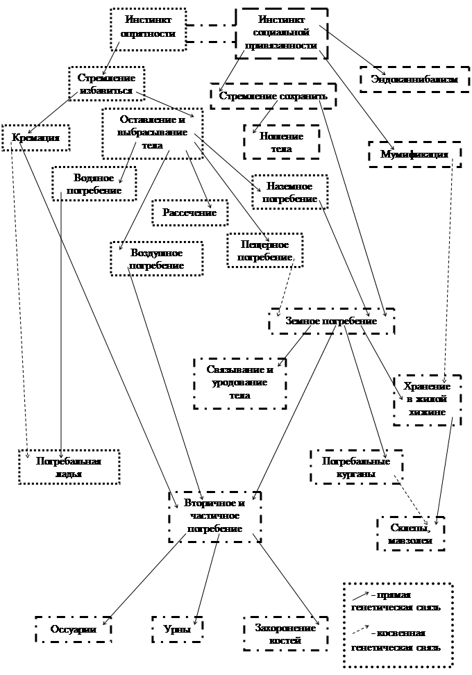 Корни погребального культа лежат в первоначальных биологических инстинктах: стремление отдалить от себя тело умершего и в то же время сохранить связь с ним. Но в погребальных обрядах на определённой стадии их развития особенно отчётливо проявляются социальные различия. Даже у народов, стоящих на стадии общинно-родового строя и не знающих классовых различий, зарождающаяся общественная дифференцация – выделение вождей, старшин, знахарей, колдунов и т.д. – отражается в способах погребения. Принято выделять шесть таких способов: оставление или выбрасывание, водяное погребение, воздушное погребение, земное или пещерное погребение, кремация, мумификация, рассечение, каннибализм. Такое разнообразие способов погребения складывалось под воздействием разнообразных исторических и просто географических условий.(см. Схему 1) [2]
