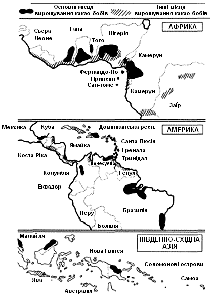 Какао-терте, какао-масло та какао-порошок є винятково імпортною продукцією. Країни-виробники переліченої продукції закуповують лише какао-боби. Їх постачальниками є Південно-Східна Азія, республіка Кот Д’Івуар (країна – основний постачальник какао-бобів в світі), Еквадор, острів Ява, острів Шрі-Ланка. Какао-продукти в Україну постачають переробні компанії, фірми з Європи та Південно-Східної Азії (Польща, Німеччина, Італія, Китай, Малайзія і т. ін.). Сировина європейських фірм вважається кращою завдяки забезпеченню високотехнологічного рівня виробництва та використанню какао-бобів африканського походження [24, 29].