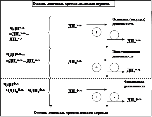 Где ДСнп - остаток денежных средств на начало периода; ДПп - поступление денежных средств за период (притоки); ДПо - выбытие денежных средств за период (оттоки); ДСкп – остаток денежных средств на конец отчетного периода.