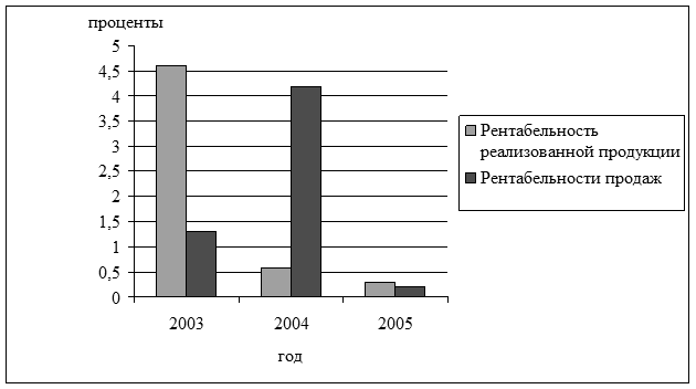 Несмотря на выгодное положение предприятия на рынке сбыта продукции, рентабельность реализации товаров в 2005 г. значительно снизилась по сравнению с предыдущим годом (0,3 %). Это снижение в большей степени было обусловлено ростом себестоимости реализованной продукции.