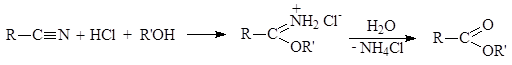 Действие на нитрилы хлороводорода в спирте приводит к образованию гидрохлоридов иминоэфиров, дальнейший гидролиз которых дает эфиры: