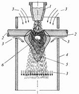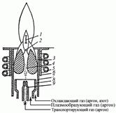 Поток аргона, подаваемый в зазор между промежуточной и внешней трубками, с одной стороны, служит плазмообразующим газом, а с другой — отжимает раскаленную плазму от стенок горелки, предохраняя их от перегрева и разрушения. Аэрозоль анализируемой пробы распространяется вдоль центрального канала разряда, практически не задевая электропроводящего скин-слоя и не влияя на его характеристики; в этом заключается одна из главных особенностей ИСП-разряда, отличающая его, например, от дуговых плазмотронов.