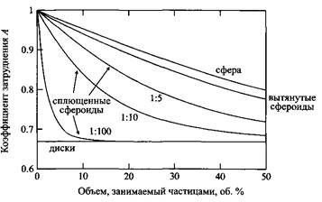 Диффузия растворителей сильно замедляется в присутствии частиц с формой сплющенных эллипсоидов или дисков и умеренно замедляется в присутствии сфер или вытянутых эллипсоидов. Показана зависимость коэффициента пространственного ограничения, т.е. соотношения коэффициентов самодиффузии растворителя в присутствии частиц, препятствующих движению молекул, и чистого растворителя, от объемной доли частиц.
