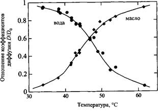 Изменение коэффициента самодиффузии при различных температурах в микроэмульсионной области показано на рис. Соотношение между коэффициентами диффузии двух растворителей сильно зависит от температуры. При низких температурах коэффициент диффузии воды близок к коэффициенту диффузии чистой воды, тогда как коэффициент диффузии масла сильно понижен. Это связано с тем, что масло заключено в замкнутые домены. При высоких температурах наблюдается обратная ситуация: незатрудненная диффузия молекул масла и движение молекул воды, ограниченное объемом капли.