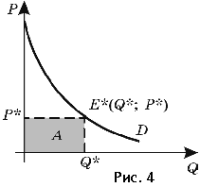 Якщо покупець здобуває товар у кількості Q* за рівноважною ціною P*, то очевидно, що загальні витрати на покупку такого товару складуть P*Q*, що дорівнює площі заштрихованої фігури A (малюнок 4).