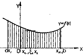 Перпендикуляри до осі 0х, проведені із точок ділення до перетину із кривою у = f (х), розділяють усю площу трапеції на n вузьких криволінійних трапецій. Замінімо кожну із цих трапецій прямокутника з основою та висотою , де . Площа кожного такого прямокутника дорівнює