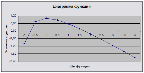 Для функции составить таблицу значений на заданном интервале с шагом и построить график. Определить максимальное и минимальное значения в таблице значений.