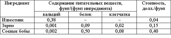 Для того чтобы цыплята достигли к восьмой неделе необходимых весовых кондиций, кормовой рацион должен удовлетворять определенным требованиям по питательности. Этим требованиям могут соответствовать смеси различных видов кормов, или ингредиентов. В качестве ингредиентов рассмотрим три: известняк, зерно и соевые бобы. Требования к питательности рациона сформулируем, учитывая три вида питательных веществ: кальций, белок и клетчатку. В таблице приведены данные, характеризующие содержание (по весу) питательных веществ в каждом из ингредиентов и удельную стоимость каждого ингредиента. Заметим, что известняк не содержит ни белка, ни клетчатки.
