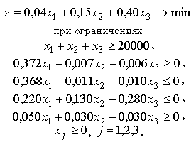 Требуется определить для птицеводческой фермы количество (в фунтах) каждого из трех ингредиентов, образующих смесь минимальной стоимости при соблюдении требований к общему расходу кормовой смеси и ее питательности.