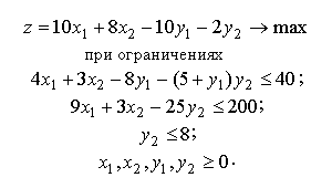 Здесь через и обозначены соответственно искомые количества производимых продуктов первого и второго видов, через - количество приобретаемых дополнительных машин для переработки сырья первого вида и через - число часов сверхурочной работы. Целевая функция представляет собой величину суммарного дохода. Первое ограничение связано с невозможностью превысить лимит времени на переработку сырья первого вида, второе - с невозможностью превысить лимит времени на переработку сырья второго вида, третье ограничение и условие неотрицательности переменных самоочевидны.