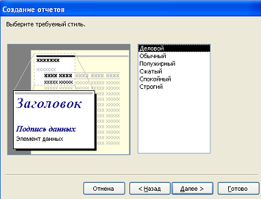 · нажмите кнопку «Далее», появляется диалоговое окно «Создание отчетов» для выбора требуемого стиля отчета;