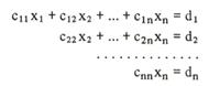 При решении методом Гаусса исходные уравнения преобразуют таким образом, что матрица коэффициентов содержит нули ниже главных диагоналей. Для этого используются операции сложения и вычитания уравнений, а также умножения их на число. При этом система принимает вид: