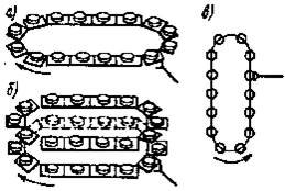 Наиболее распространены ленточные (рис. 8, а) и цепные (рис. 8, б) конвейеры. Грузонесущим и тяговым органом для перемещения заготовок в таких конвейерах служит лента (обычно металлическая) или втулочно-роликовая цепь, которые натянуты на барабаны или звездочки, смонтированные в корпусе. Для предотвращения их провисания предусмотрены направляющие планки.