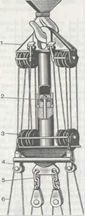 УНІВЕРСАЛЬНИЙ ВАНТАЖОЗАХВАТНИЙ ПРИСТРІЙ ЗГІДРОКАНТОВАЧЕМ: 1 - верхня обойма поліспас, 2 - гідротормоз, 3 - нижня обойма поліспасту, 4 - розчалка, 5 - блочна підвіска, 6 - стропикріплення панелі на панелі-возі, прибирає столик-стремянку і дає машиністу крана команду натягнути гілки.