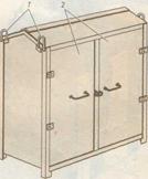 Контейнер (18) для зберігання одягу, інструменту і приладдя бригади мулярів має відділення для двох змін. Технологічно необхідний набір інструменту, пристосувань та інвентаря, розрахований на бригаду мулярів, називають нормокомплектом. Його бережливе використання сприяє підвищенню якості і продуктивності праці муляра.