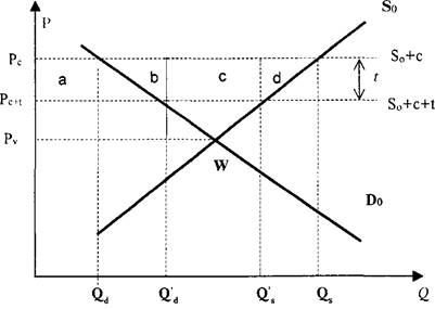 Рівновага попиту і пропозиції в умовах вільної торгівлі буде досягнута в точці (W), в якій обсяг пропозиції товару позначено Сд., а внутрішній попит —Qd