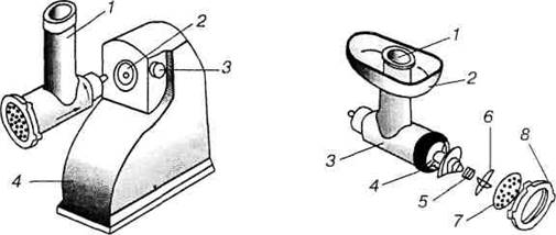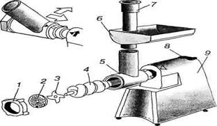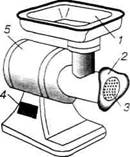 », Чехія) (рис. 5.2). Призначена для подрібнювання м'яса, риби та начинювання кишок фаршем для приготування домашньої ковбаси та купатів. Машина складається із корпусу, завантажувальної тарілки, штовхача, шнека, ножа із нержавіючої сталі, трьох решіток з діаметром отворів 3, 4,5 і 8 мм, наживної гайки, електродвигуна, вимикача, контейнера для зберігання шнура. Розвантажувальним пристроєм машини є торець камери обробки, що має зовнішню різьбу, на яку нагвинчується натискна гайка. Кожна решітка має паз, а на корпусі — виступ (шпонку), що забезпечує нерухомість решіток. Потужність м'ясорубки 1300 Вт. Для приготування домашньої ковбаси в машині передбачено насадку «Куббе», яку вставляють замість ножа та решітки. Перед використанням насадки м'ясо має бути подрібненим.