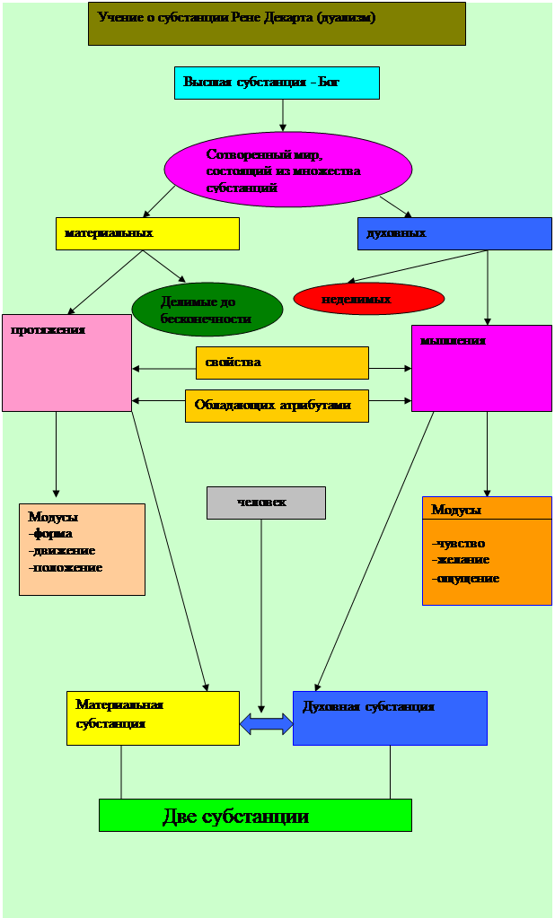 Дуализм Р. Декарта выражается в следующем учении. Сотворенные субстанции Р. Декарт делит на два рода: духовные и материальные. Первая неделима, ее основной атрибут – мышление. Модусы мышления – воображение, чувство и желание. Вторая делима до бесконечности, основной атрибут – протяженность. Модусы протяженности – фигура, положение, движение. Эти субстанции независимы друг от друга, согласовываются они между собой Богом.