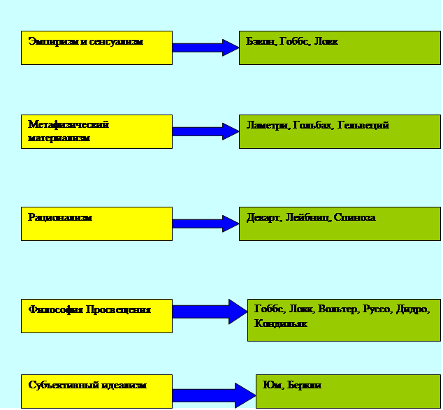 Наиболее значительными последователями эмпирической линии в философии нового времени были Т. Гоббс, Д. Локк, Дж. Беркли, Д. Юм – в Англии; Э. Кондильяк, К. Гельвеций, П. Гольбах, Д. Дидро– во Франции.