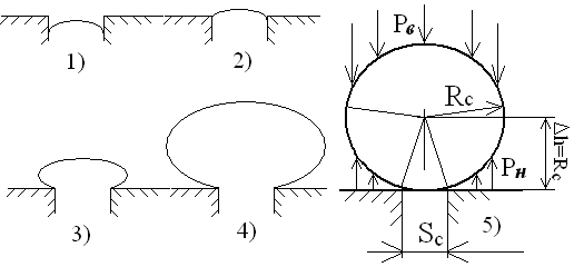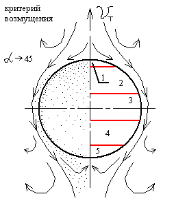 /R. Очевидно, именно эта сила и является одним из факторов, обеспечивающих перемешивание воздуха и воды. Верхняя часть пузырька (1) рассекает собой водную среду при подъеме. Ее можно считать фактически плоской, и поэтому, действие на ней центробежной силы пренебрежимо мало. С зоны (1) вода стекает в область (2), которая характеризуется значительным ростом угла (15–75º) на небольшом перепаде высоты. Увеличение угла при этом, приводит к значительному росту площади пузыря в этой области по мере изменения высоты. В результате, к водам, стекающим с зоны (1) примешиваются дополнительные объемы воды, формируя мощные потоки, омывающую всю зону (2). В зоне (2) действует значительная центробежная сила, вызывая интенсивное перемешивание слоев обоих сред в граничной зоне. При этом, водные потоки захватывают частицы из приповерхностных слоев, и их концентрация постепенно увеличивается по мере приближения к зоне (3). Зона (3) характеризуется незначительным действием как разбавляющих потоков, так и центробежной силы. В результате, на уровне этой зоны происходит просто перекачивание находящихся в переходных слоях частиц. При этом, пополнение потоков новыми частицами, попавшими из газовой среды увеличивается незначительно. В зоне (4) вновь усиливается центробежная сила, а уменьшение площади при приближении к зоне (5) приводит к интенсивному высвобождению ранее захваченных водных объемов. В результате, на уровне зоны (4) образуются вихревые и турбулентные потоки, способствующие рассеиванию в окружающий объем захваченных из пузыря частиц. Интенсивно происходит захват частиц из газовой среды. В зоне (5) некоторое снижение центробежной силы компенсируется интенсивным процессом омывания пузыря. Продолжается значительное поглощение частиц водой из хвостовой части, по краям которой образуются мощные вихревые потоки. Таким образом, интенсивное поглощение водой частиц из пузырька происходит во всех областях, исключая 1 и 3.