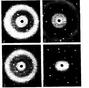 Рис 6 Рентгенограммы растворов ЦЭЦ в ДМФА при концентрации 38 (а), 50 (б), 28% (в); г - 38%-ный раствор при сдвиговой деформации; б, г - рентгенограммы сняты при большем расстоянии от образца до фотопленки