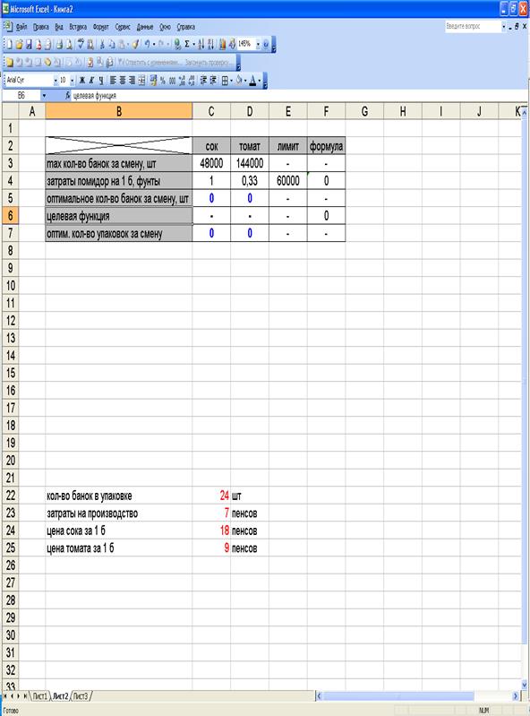 Условие задачи: консервный завод Popeye перерабатывает за смену 60000 фунтов спелых помидор (7 пенсов за фунт) в томатный сок и пасту. Готовая продукция пакетируется в упаковки по 24 банки. Производство одной банки сока требует одного фунта спелых помидоров, а одной банки пасты – трети фунта. Заводской склад может принять за одну смену только 2000 упаковок сока и 6000 упаковок пасты. Оптовая цена одной упаковки томатного сока составляет 18 долл., одной упаковки томатной пасты – 9 долл.