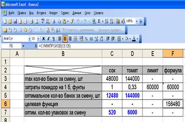 Таким образом, была определена оптимальная структура производства консервного завода. Ей является производство за смену 12 480 банок сока и 144 000 банок томата (соответственно 520 и 6000 упаковок).