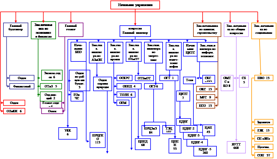 Основные характеристики организационной структуры — численность управленческого персонала по функциям управления, численность линейного управленческого персонала, количество уровней иерархии системы управления предприятием, количество структурных звеньев на каждом уровне, степень централизации управления.