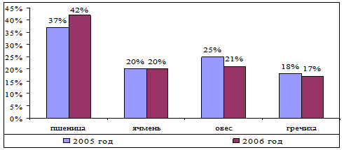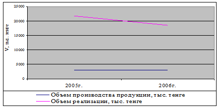 Из высше указаной таблицы видно, что объем производства в натуральном выражении имеет положительный рост по пшенице увеличение по отношению к 2005 году составило 8 тонн, но снижение произожло за счет структуры и составило 154 тыс. тенге.