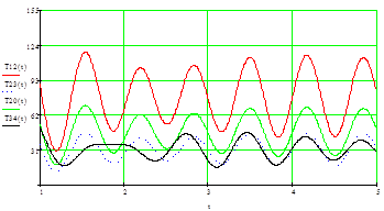 Анализ результатов расчета показал, что в некоторые моменты времени натяжения нитей становятся отрицательными, а сила сцепления превышает свое предельное значение, и, следовательно, принятая математическая модель не соответствует поведению механической системы: нити провисают, тела движутся рывками, а каток 4 – с проскальзыванием.