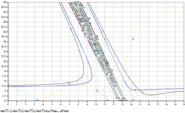 Чтобы определить области допустимых значений для масс груза 1 и катка 4, нарисуем линии уровней всех функций на одном рисунке: