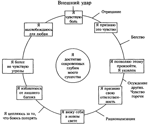 С завершением полного оборота “Колеса развития” человек становится более свободным для любви, более способным идти на уступки и более ранимым. Затем вновь происходит что-то неприятное, и колесо снова начинает вращаться — но на этот раз путешествие значительно короче. Человек двигается быстрее, и по более короткому пути. Каждое внешнее воздействие отправляет человека для совершения еще одного круга развития — однако радиус такого круга все меньше и меньше, так что я как бы двигаюсь по спирали, которая завершается в самых глубинах человеческой сущности, там, где обитает Бог, где человек уже не чувствую боли и не должен поэтому отправляться в следующее кругообращение.
