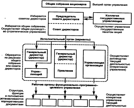 Законодательством установлены лишь состав, компетенция и правила организации высших звеньев управления обществом: общего собрания акционеров, совета директоров и правления. В акционерных обществах, крупные пакеты акций которых принадлежат государству, подсистема высшего руководства дополняется управляющим (коллегией управляющих), который представляет интересы государства в рамках компетенции по управлению государственным имуществом.