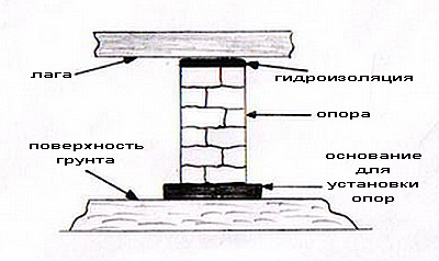 Спочатку зрізують рослинний грунт і на його місце укладають суху землю, яку ретельно утрамбовують, зволожують. Потім у неї утоптують щебінь або гравій на глибину не менше 4 см. Таку основу роблять вище рівня зовнішнього вимощення не менше ніж на 10-15 см. На вирівняну укладену основу укладають цегляні стовпчики 25x25 см заввишки в 2 ряди кладки (15 см). Відстань в ряду стовпчиків вздовж лаги залежить від висоти лаги. Зазвичай лаги беруть висотою 8 см із брусів 6x8 см або з полу брусів діаметром 16 см. У цьому випадку зазначена відстань повинна становити 80-100 см.