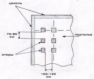 Оскільки кінці лаг будуть укладатися на поверхню цоколя, то цоколь і слугуватиме орієнтиром висоти опорних стовпчиків - висота опор, повинна відповідати висоті цоколя.