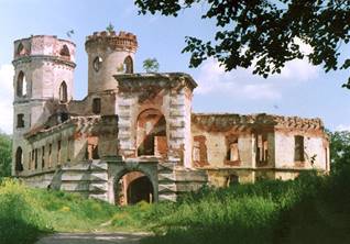 Следующий участок на берегу реки невелик и состоит из амфитеатра, т.е. полулунных террас, спускающихся к зеленой площадке на левом берегу. На этой площадке когда-то били фонтаны, а наверху полукругом посажены высокие ели. Напротив, на холме находится монументальная скамья, и все вместе представляет своеобразную северную переделку итальянских садовых театров. К сожалению, не сохранилось чаши фонтана и ни одного изображения, целы только трубы и далеко в чаще резервуар - Фонтанный пруд. Эта часть парка заканчивается мостом у Пиль-башни - одного из излюбленных мотивов пейзажных парков, состоящего из полуразрушенной башни-мельницы. На самом деле мельницы никогда не существовало, а была холодная мыльня с каскадом, устроенным так, что под него можно было садиться. Художники иначе дополняли картину, добиваясь иллюзии пейзажа Буше или Робера. Трудно судить о том, насколько это соответствовало действительности, но приходится сомневаться в достаточности иллюзии, так как на противоположном берегу находится Хмелевая беседка из стриженой зелени, скорее напоминающая трельяжи леблоновских садов, чем развалины Ю. Робера.