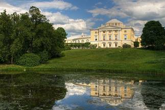Дворец, построенный Камероном, поставлен среди рощ на высоком берегу реки. Как уже сказано, он состоит из центрального, почти кубического, флигеля и более низких боковых, отогнутых от реки. Фасад украшен парными колоннами, а на крыше возвышается легкий купол, поддерживаемый массой деревянных колонн. Со стороны речки вид на дворец удивительно красив, особенно потому, что с двух его сторон к реке спускаются густые группы деревьев, середина же ската покрыта зеленой травой.